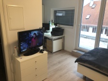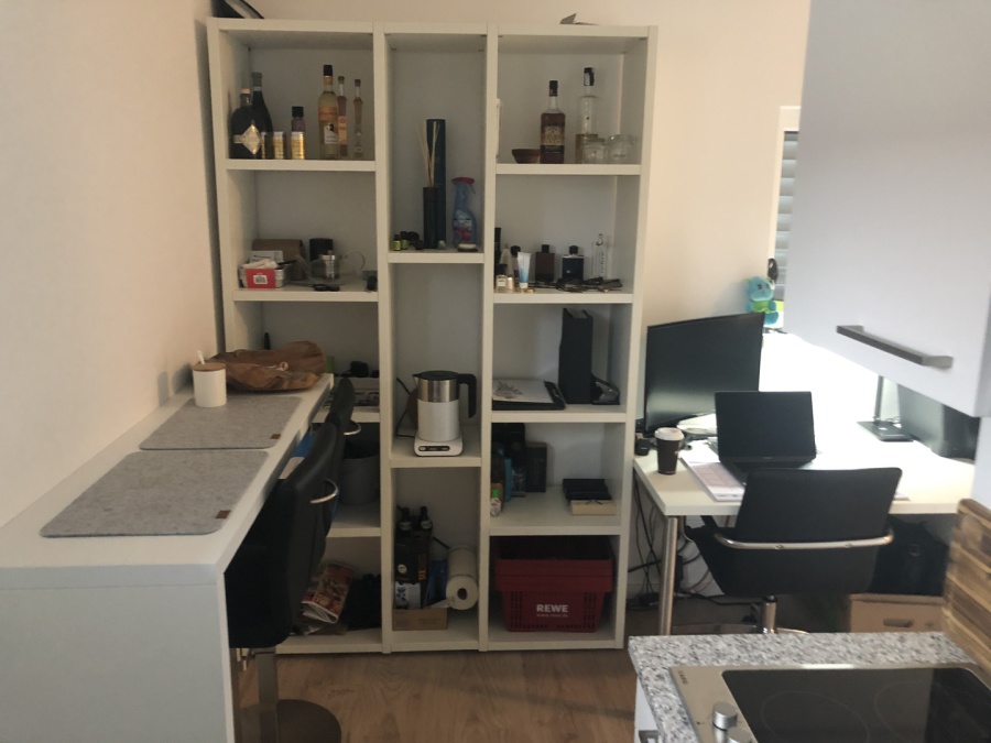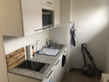 Der Eingangsbereich öffnet sich dann in den geräumigen Wohn- und Schlafbereich mit einer großen Fensterfront, zugleich Zugang zur Dachterrasse. Die schöne und zugleich moderne Küchenzeile mit einer Pantry befindet sich, vom Eingangsbereich nicht einsehbar, in einem kleinen Separee mit zusätzlichem Fenster. Die Küche verfügt über einen *** Kühl-/Gefrierschrank und eine Mikrowelle mit Grillfunktion sowie ein Zwei-Platten-Ceran-Kochfeld.